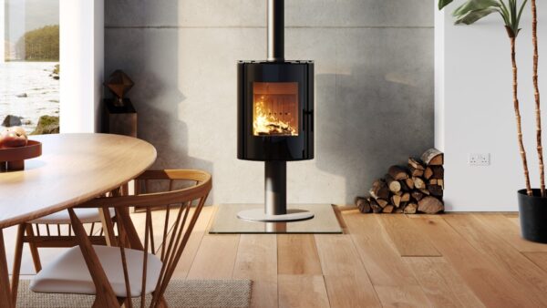 Embrace the warmth and beauty of the Osprey eVe, gracefully perched on a pedestal base. Its modern design is enhanced by a beautiful curved black glass door, making it a standout piece that combines aesthetics and efficient heating in perfect harmony. Adding a touch of elegance to any living space while providing efficient heating. A log-store cupboard base is also available as an option.